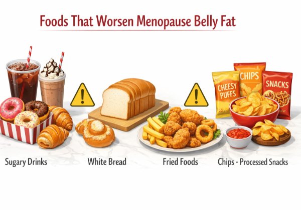 Women trying to reduce menopause belly fat should limit ultra-processed foods, sugary drinks, refined carbohydrates, and excessive alcohol. These foods can increase blood sugar spikes and promote fat storage. Replacing them with whole foods such as vegetables, lean protein, and whole grains helps support better metabolic health.